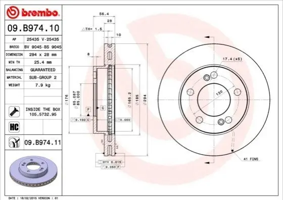 BREMBO 09.B974.11 диск гальмівний (передній) Ssangyong Actyon/Kyron/RX270 04- (294x28)