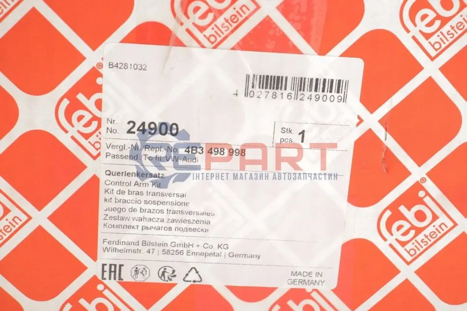 Всі запасні деталі від виробника FEBI мають якість, підтверджене сертифікатами системи TUV відповідно до вимоги стандартів ISO 9002. Тому кожна деталь має довгострокову гарантію. Асортимент запасних частин компанії-виробника FEBI повністю покриває потребу таких автомобільних брендів, як BMW, RENAULT, OPEL, VW, ALFA ROMEO, VOLVO, MERCEDES, AUDI, PEUGEOT, FIAT, Mikra, Note, Almera, Primera, X-Trail, Murano, QASHQAI, Infiniti.