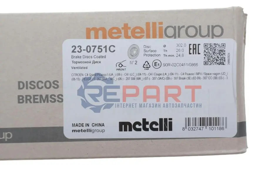 Metelli 230751C диск гальмівний (передній) Citroen C4 04-13/Peugeot 207/308 07-14/307 03-09 (302x26) (з покр) (вент.)