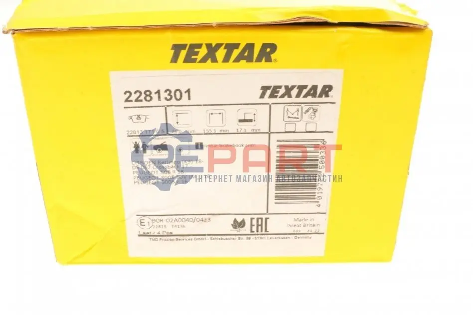 Продукція, запропонована TEXTAR на вторинному ринку, має таку ж якість, як і та, що поставляється на конвеєр. Склад фрикційного матеріалу підбирається для кожного конкретного автомобіля і проходить багатокілометрові випробування в реальних умовах і багато годинні тести на стендах. Кожен тип колодок проходить: понад 300000 км випробувань, випробування на шум і вібрацію, більше 1000 годин динамометричних випробувань, комп'ютерну оцінку гальмівних якостей і структури зносу.