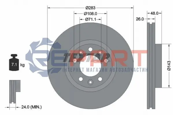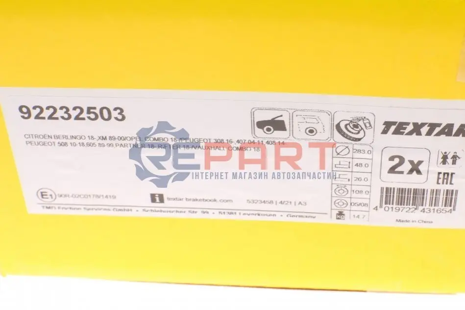 TEXTAR 92232503 диск гальмівний (передній) Peugeot 407 04-10/ 508 10-18/ Citroen Berlingo 18- (283x26) PRO